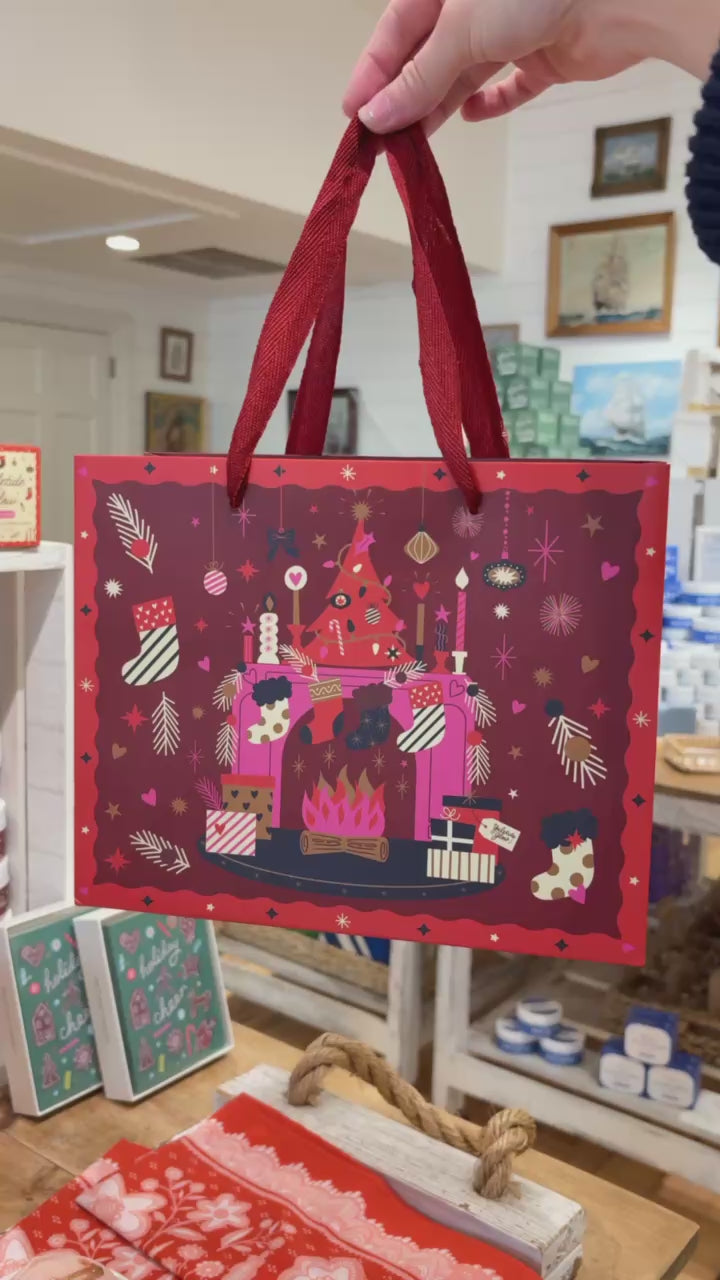 Bring the warmth of the holidays to every gift with our Yuletide Glow™ Holiday Gift Bag, featuring a charming, whimsical fireplace scene surrounded by stockings, glowing embers, and festive presents. Inspired by the comforting scent of Yuletide Glow™, this bag captures the essence of the season.